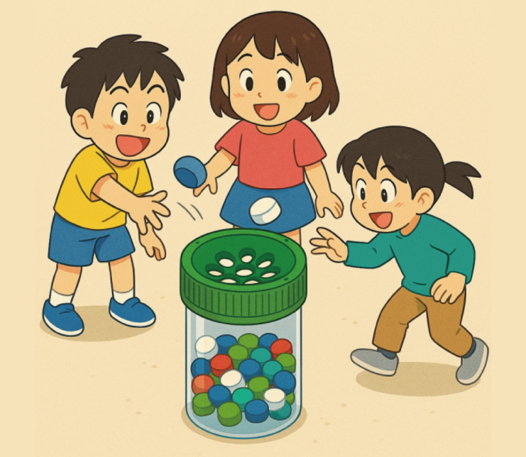 おうちで集めたキャップをできるだけ持ってきて、キャップインゲームで 遊びながら学びましょう!キャップは捨てずに 新しく生まれ変わります!みんなで楽しく未来を守ろう✨(キャップは資源として回収します。)